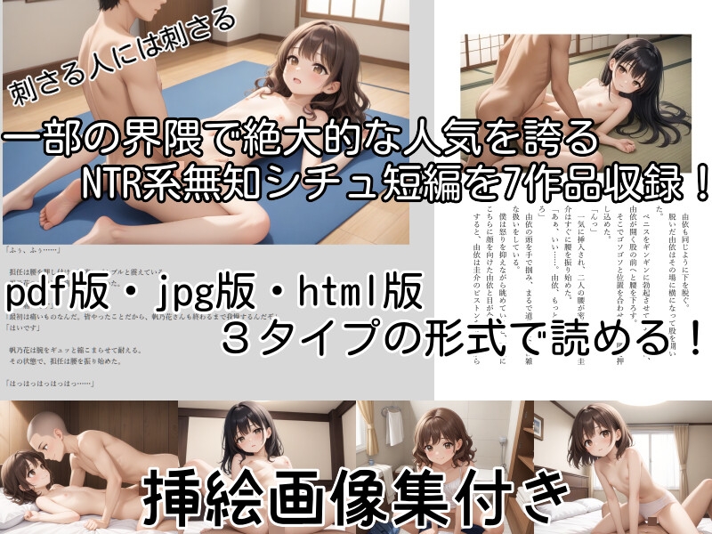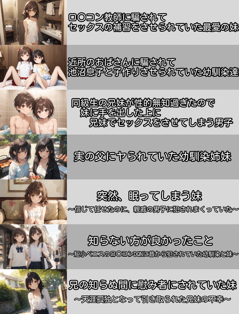 HOME > ノベル > ノベル NTR無知シチュの書 ~ヤられてた女の子達の無知シチュ短編集~ 2026年2月6日 作品ページを見る 寝取られ評価寝取られ度★☆☆☆☆背徳度★★★★☆脳破壊度★☆☆☆☆ 作品ページを見る サークル名しろよもぎ工房 販売日2026年02月06日 0時シリーズ名無知シチュの書ジャンル少女 BSS 寝取られ 寝取り 近親もの 中出し 妊娠/孕ませ 年齢指定18禁作品カテゴリ同人作品形式ノベルファイル容量212.44MB体験版体験版ダウンロード品番RJ01535052価格792円~ 文字数10万文字、フルカラーCG36枚収録! ※この作品は以前ci-enやfantiaなどで有料公開(一部無料公開)していたものを改稿して挿絵を付けたものです。 ※ここでのNTRは『幼馴染や妹など身近な異性が、無知に付け込まれて他の男にヤられまくっていたことを後から知る』という感じです。 その後、便乗して主人公もヤらせてもらうパターンが多め。 収録作品 ■収録作品 1.ロ〇コン教師に騙されてセックスの補習をさせられていた最愛の妹 2.近所のおばさんに騙されて、池沼息子と子作りさせられていた幼馴染達 3.同級生の兄妹が性的無知過ぎたので、妹に手を出した上に兄妹でセックスをさせてしまう男子 4.実の父にヤられていた幼馴染姉妹 5.突然、眠ってしまう妹 ~信じて任せたのに、親戚の男子に犯されまくっていた~ 6.知らない方が良かったこと ~短小ペニスのロ〇コンDQNに昔から犯されていた幼馴染と妹~ 7.兄の知らぬ間に慰み者にされていた妹 ~天涯孤独となって引き取られた兄妹の不幸~ ※一部作品は有料掲載版からタイトルを変更しています。 ◆内容物 1.本編 pdfファイル 2.本編 jpeg画像 3.本編 htmlファイル 4.挿絵画像集 5.ReadMe ■本編 ページ数:全284ページ 文字数:10万文字 挿絵枚数:36枚(全カラー) ■注意事項■ ・この作品は性的描写が含まれている成人向け作品です。 18歳未満の方の購読、譲渡等の行為を禁じます。 ・この作品はフィクションです。実在する人物・団体などとは一切関係ありません。 登場するキャラクターは全て18歳以上であり、架空のものです。 ■AIの利用■ 表紙、挿絵はAI生成画像を加工修正して使用しております。 作品ページを見る Post Share Pocket Hatena Pinterest LINE コメント URLコピー -ノベル -BSS, 中出し, 妊娠/孕ませ, 寝取られ, 寝取り, 少女, 近親もの